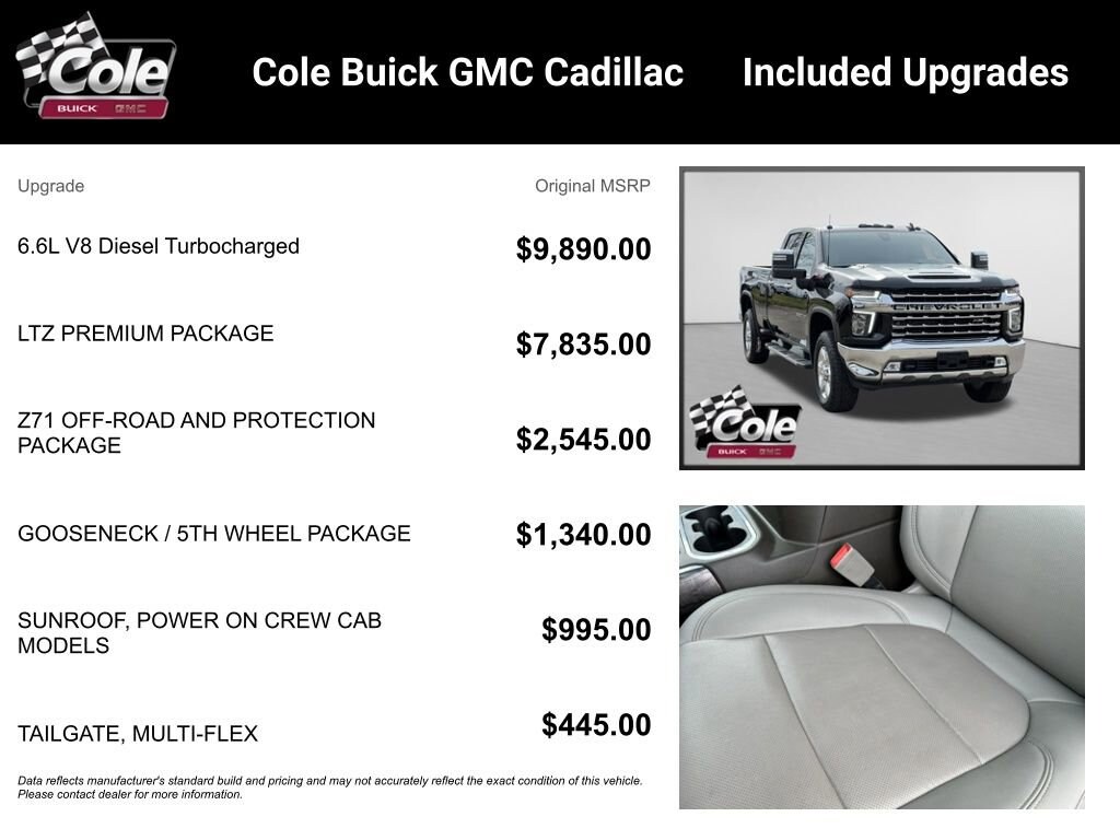 Recent Arrival! Priced below KBB Fair Purchase Price!Black 2022 Chevrolet Silverado 3500HD LTZ 4D Crew Cab 4WD 10-Speed Automatic Duramax 6.6L V8 TurbodieselCertified. Chevrolet Certified Pre-Owned Details:* 24 months/24,000 miles (whichever comes first) Certified Pre-Owned Scheduled Maintenance Plan and 3 days/150 miles (whichever comes first) Vehicle Exchange Program. SiriusXM 3-month trial subscription.* Powertrain Limited Warranty: 72 Month/100,000 Mile (whichever comes first) from original in-service date* 172 Point Inspection* Roadside Assistance* Vehicle History* Transferable Warranty* Warranty Deductible: $0* Limited Warranty: 12 Month/12,000 Mile (whichever comes first) from certified purchase dateChevrolet Certified Pre-Owned Certified, 10-Speed Automatic, 4WD, Gideon/Very Dark Atmosphere Leather, 10-Way Power Driver Seat Adjuster w/Lumbar, 10-Way Power Passenger Seat Adjuster w/Lumbar, 12-Volt Rear Auxiliary Power Outlet, 120-Volt Bed Mounted Power Outlet, 120-Volt Instrument Panel Power Outlet, 170 Amp Alternator, 2 USB Ports (First Row), 2 USB Ports Inside Console, 2-Speed Active Transfer Case, 220 Amp Alternator, 2nd Row Dual USB Charge-Only Ports, 4-Wheel Disc Brakes, 4.2 Diagonal Color Display Driver Info Center, 6 Speakers, 6-Speaker Audio System Feature, 8 Driver Information Center, ABS brakes, Air Conditioning, AM/FM radio: SiriusXM with 360L, Apple CarPlay/Android Auto, Auto-dimming door mirrors, Auto-Dimming Inside Rear-View Mirror, Auto-Dimming Inside Rearview Mirror w/Camera, Auto-dimming Rear-View mirror, Automatic Emergency Braking, Automatic temperature control, Bed View Camera w/2 Trailer Camera Provisions, Bluetooth® For Phone, Bose Premium 7 Speaker Sound System, Brake assist, Bumpers: chrome, Chevrolet Connected Access Capable, Chevytec Spray-On Black Bedliner w/Chevrolet Logo, Chrome Front Grille Bar w/Chrome Grille Inserts, Chrome Mirror Caps, Color-Keyed Carpeting Floor Covering, Compass, Compass Located In Instrument Cluster, Deep-Tinted Glass, Delay-off headlights, Driver door bin, Driver Memory, Driver vanity mirror, Dual front impact airbags, Dual front side impact airbags, Durabed Pickup Bed, Electric Rear-Window Defogger, Electrical Lock Control Steering Column, Electronic Stability Control, Engine Block Heater, Exhaust Brake, EZ Lift Power Lock & Release Tailgate, Floor-Mounted Center Console, Following Distance Indicator, Forward Collision Alert, Front 40/20/40 Split-Bench Seats w/Lockable Storage, Front anti-roll bar, Front Bucket Seats, Front Center Armrest w/Storage, Front dual zone A/C, Front fog lights, Front LED Fog Lamps, Front License Plate Kit, Front reading lights, Front Rubberized Vinyl Floor Mats, Front wheel independent suspension, Fully automatic headlights, Gooseneck/5th Wheel Package, Gooseneck/5th Wheel Prep Package, HD Rear Vision Camera, HD Surround Vision w/2 Trailer View Camera Provisions, Heated 2nd Row Outboard Seats, Heated door mirrors, Heated Driver & Front Outboard Passenger Seats, Heated front seats, Heated Steering Wheel, Heated steering wheel, Heavy Duty Front Spring/Camper Package, Heavy-Duty 80 Amp Battery, Hitch Guidance w/Hitch View, Illuminated entry, Integrated Trailer Brake Controller, IntelliBeam Automatic High Beam On/Off, Keyless Open & Start, Lane Change Alert w/Side Blind Zone Alert, Lane Departure Warning System, Leather-Wrapped Steering Wheel, LED Cargo Area Lighting, Low tire pressure warning, LTZ Convenience Package, LTZ Convenience Package II, Manual Tilt/Telescoping Steering Column, Memory seat, Multi-Flex Tailgate, Multicolor 15 Diagonal Head-Up Display, Not Equip w/Ventilated Seat Cushion Blower Motor, Not Equipped w/Front & Rear Park Assist, Occupant sensing airbag, OnStar & Chevrolet Connected Services Capable, Outside temperature display, Overhead airbag, Overhead console, Panic alarm, Passenger door bin, Passenger vanity mirror, Perf Leather-Appointed