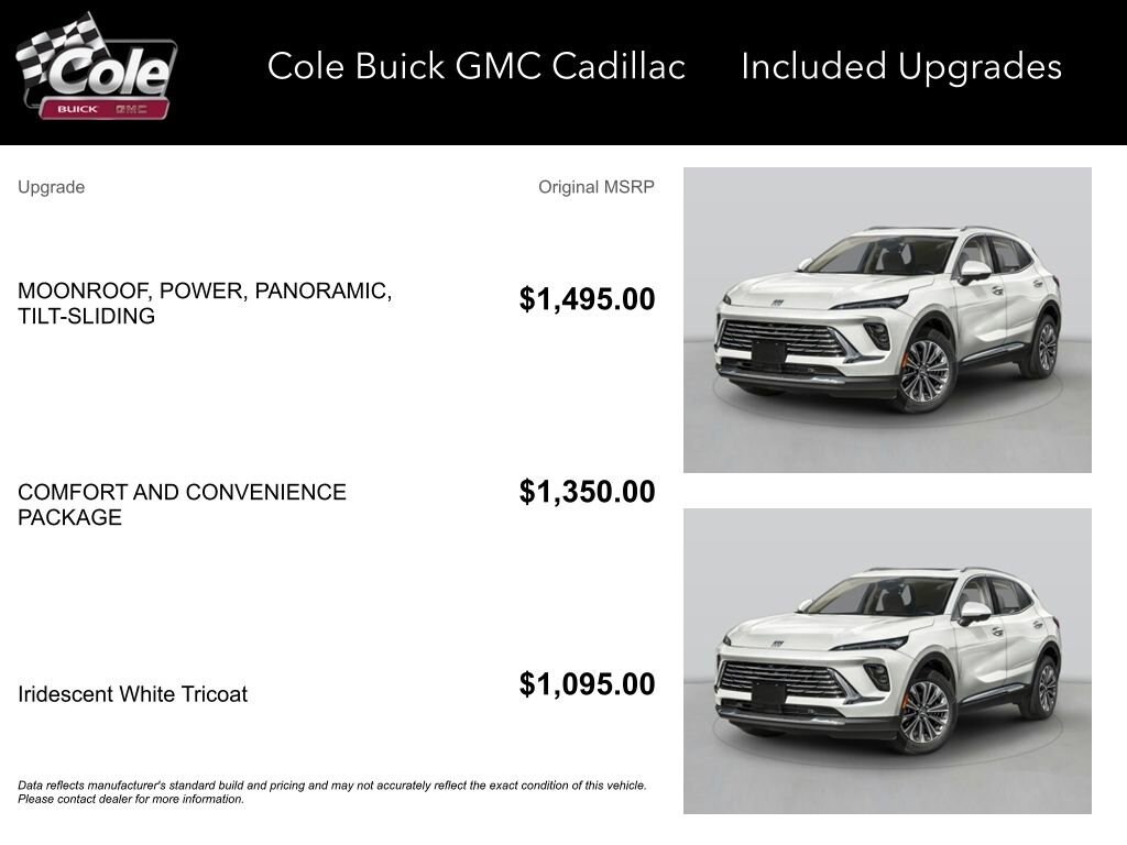 3-Channel Programmable Universal Home Remote, 3.47 Final Drive Axle Ratio, 30 Diagonal LCD Display, 4-Wheel Disc Brakes, 9 Speakers, ABS brakes, Air Conditioning, Air Quality Indicator Sensor, Alloy wheels, AM/FM radio: SiriusXM, Auto High-beam Headlights, Auto-dimming door mirrors, Auto-dimming Rear-View mirror, Automatic Air Recirculation, Automatic temperature control, Bose Premium 9-Speaker Audio System Feature, Brake assist, Bumpers: body-color, Comfort and Convenience Package, Compass, Delay-off headlights, Driver 4-Way Power Lumbar Seat Adjuster, Driver 8-Way Power Seat Adjuster, Driver door bin, Driver vanity mirror, Dual front impact airbags, Dual front side impact airbags, Dual-Zone Automatic Climate Control Air Conditioning, Electronic Stability Control, Emergency communication system: OnStar and Buick connected services capable, Exterior Parking Camera Rear, Four wheel independent suspension, Front anti-roll bar, Front Bucket Seats, Front Center Armrest, Front Passenger 6-Way Manual Seat Adjuster, Front reading lights, Fully automatic headlights, Hands-Free Power Programmable Liftgate, Heads-Up Display, Heated door mirrors, Heated Driver and Front Passenger Seats, Heated Steering Wheel, Illuminated entry, Knee airbag, Leather steering wheel, Low tire pressure warning, Memory seat, Navigation System, Occupant sensing airbag, Outside temperature display, Overhead airbag, Overhead console, Panic alarm, Passenger door bin, Passenger vanity mirror, Perforated Leatherette Seat Trim, Power door mirrors, Power driver seat, Power Liftgate, Power Panoramic Tilt-Sliding Moonroof, Power steering, Power windows, Preferred Equipment Group 1SC, Premium audio system: Buick Infotainment System, Radio data system, Radio: Infotainment Center, Rear anti-roll bar, Rear reading lights, Rear seat center armrest, Rear window defroster, Rear window wiper, Remote keyless entry, Security system, SiriusXM Trial Subscription, Speed control, Split folding rear seat, Spoiler, Steering wheel mounted audio controls, Telescoping steering wheel, Tilt steering wheel, Traction control, Trip computer, Variably intermittent wipers, Wheels: 18 Alloy with Technical Gray, Wireless Apple CarPlay/Wireless Android Auto.