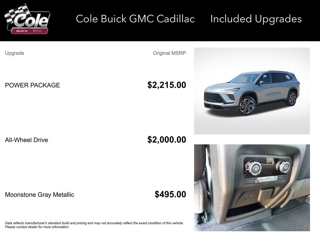 AWD, 110-Volt Power Outlet, 12 Speakers, 2nd Row 1-Touch Flat Folding Seat, 3rd Row 60/40 Power Split-Folding Bench Seat, 3rd row seats: split-bench, 4-Wheel Disc Brakes, ABS brakes, Air Conditioning, Alloy wheels, AM/FM radio: SiriusXM with 360L, Apple CarPlay/Android Auto, Auto High-beam Headlights, Auto-dimming door mirrors, Auto-dimming Rear-View mirror, Automatic temperature control, Bose Premium 12-Speaker Audio System with Subwoofer, Brake assist, Bumpers: body-color, Compass, Delay-off headlights, Driver 4-Way Power Lumbar Seat Adjuster, Driver 8-Way Power Seat Adjuster, Driver door bin, Driver vanity mirror, Dual front impact airbags, Dual front side impact airbags, Electronic Stability Control, Emergency communication system: OnStar and Buick connected services capable, Four wheel independent suspension, Front anti-roll bar, Front Bucket Seats, Front Center Armrest, Front dual zone A/C, Front Passenger 4-Way Power Lumbar Seat Adjuster, Front Passenger 6-Way Power Seat Adjuster, Front reading lights, Fully automatic headlights, Head-Up Display, Heated door mirrors, Heated Driver and Front Passenger Seats, Heated front seats, Heated steering wheel, Heated Wiper Park, Illuminated entry, Inside Rearview Auo-Dimming Rear Camera Mirror, Leather steering wheel, Low tire pressure warning, Memory Settings, Navigation System, Occupant sensing airbag, Outside temperature display, Overhead airbag, Overhead console, Panic alarm, Passenger door bin, Passenger vanity mirror, Perforated Leatherette Seat Trim, Power door mirrors, Power driver seat, Power Liftgate, Power Package, Power passenger seat, Power steering, Power windows, Preferred Equipment Group 1SM, Premium audio system: Buick Infotainment System, Radio data system, Radio: Infotainment Center, Rear air conditioning, Rear anti-roll bar, Rear reading lights, Rear side impact airbag, Rear window defroster, Rear window wiper, Remote keyless entry, Security system, SiriusXM with 360L Trial Subscription, Speed control, Speed-sensing steering, Spoiler, Sport steering wheel, Steering wheel mounted audio controls, Tachometer, Telescoping steering wheel, Tilt steering wheel, Traction control, Trip computer, Turn signal indicator mirrors, Universal Home Remote, Variably intermittent wipers, Voltmeter, Wheels: 20 Alloy with High Gloss Black and Machine Finish, Wireless Apple CarPlay, Wireless Google Android Auto, AWD.
