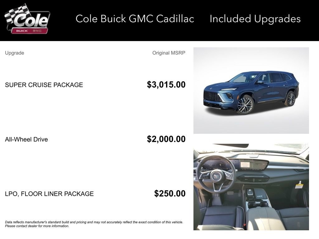 AWD, 16 Speakers, 1st & 2nd Row All-Weather Floor Liners (LPO), 3rd Row All-Weather Floor Liner (LPO), 3rd row seats: split-bench, 4-Wheel Disc Brakes, ABS brakes, Adaptive suspension, Air Conditioning, Alloy wheels, AM/FM radio: SiriusXM with 360L, Apple CarPlay/Android Auto, Auto High-beam Headlights, Auto tilt-away steering wheel, Auto-dimming door mirrors, Auto-dimming Rear-View mirror, Automatic temperature control, Bose Performance 16-Speaker Audio System, Brake assist, Bumpers: body-color, Compass, Delay-off headlights, Driver 4-Way Power Lumbar Seat Adjuster, Driver 8-Way Power Seat Adjuster, Driver Attention Assist, Driver door bin, Driver Massage Control w/4-Way Power Lumbar, Driver vanity mirror, Dual front impact airbags, Dual front side impact airbags, Electronic Stability Control, Emergency communication system: OnStar and Buick connected services capable, Enhanced Automatic Parking Assist, Floor Liner Package (LPO), Four wheel independent suspension, Fr Passenger Massage Control w/4-Way Power Lumbar, Front anti-roll bar, Front Bucket Seats, Front Center Armrest, Front dual zone A/C, Front Passenger 4-Way Power Lumbar Seat Adjuster, Front Passenger 6-Way Power Seat Adjuster, Front reading lights, Fully automatic headlights, Garage door transmitter, Heads-Up Display, Heated door mirrors, Heated Driver & Front Passenger Seats, Heated front seats, Heated rear seats, Heated steering wheel, Illuminated entry, Integrated Cargo Liner (LPO), Leather steering wheel, Low tire pressure warning, Memory seat, Memory Settings, Navigation System, Occupant sensing airbag, Outside temperature display, Overhead airbag, Overhead console, Panic alarm, Passenger door bin, Passenger vanity mirror, Power door mirrors, Power driver seat, Power Liftgate, Power moonroof, Power passenger seat, Power steering, Power windows, Preferred Equipment Group 1SP, Premium audio system: Buick Infotainment System, Quilted & Perforated Leather-Appointed Seat Trim, Radio data system, Radio: Infotainment Center, Rain sensing wipers, Rear air conditioning, Rear anti-roll bar, Rear reading lights, Rear side impact airbag, Rear window defroster, Rear window wiper, Remote keyless entry, Security system, SiriusXM w/360L Trial Subscription, Speed control, Speed-sensing steering, Spoiler, Steering wheel memory, Steering wheel mounted audio controls, Super Cruise, Super Cruise Package, Tachometer, Telescoping steering wheel, Tilt steering wheel, Traction control, Trip computer, Turn signal indicator mirrors, Variably intermittent wipers, Ventilated Driver & Front Passenger Seats, Ventilated front seats, Ventilated rear seats, Voltmeter, Wheels: 22 Alloy w/Avenir Pearl Nickel Finish, Wireless Apple CarPlay, Wireless Google Android Auto, AWD.