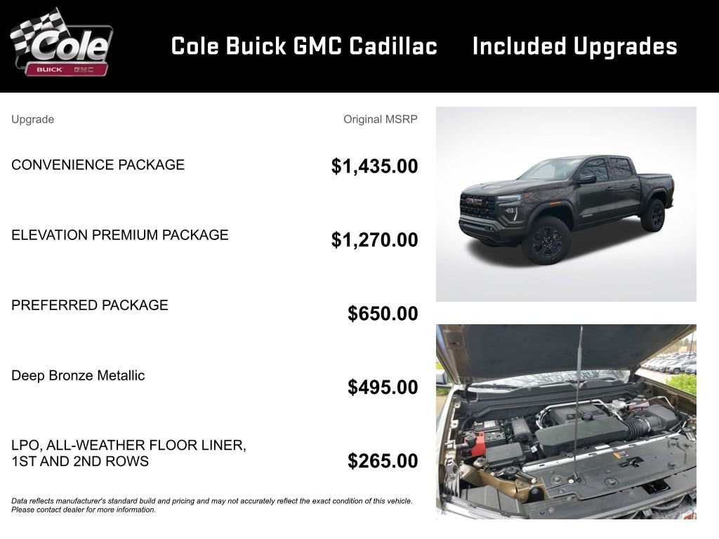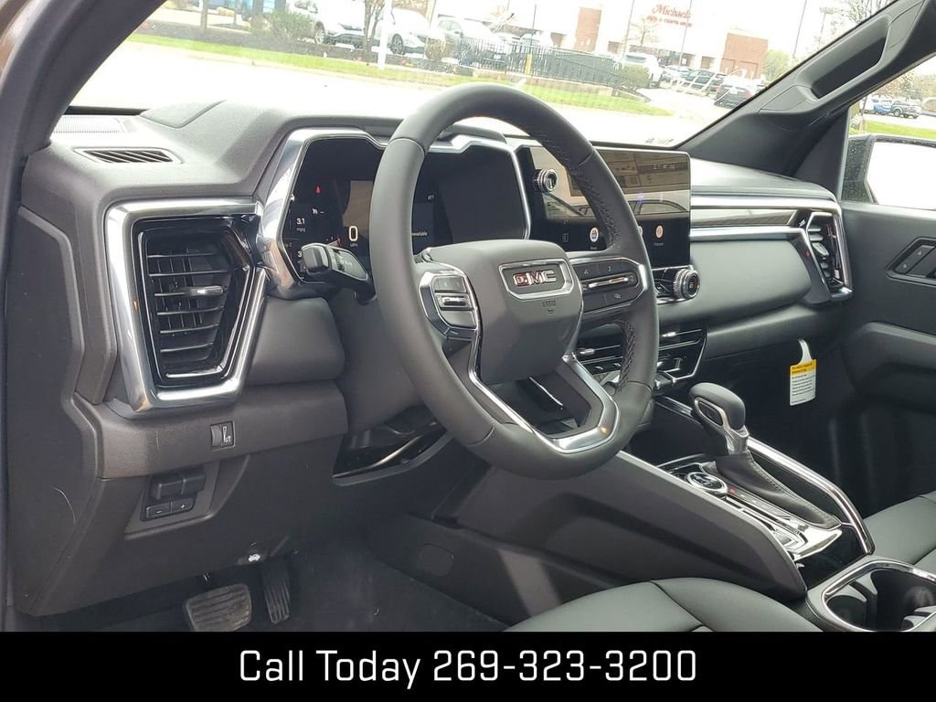 4WD, 1 Rear USB Port in Center Console (Charge-Only), 120-Volt Bed Mounted Power Outlet, 1st & 2nd Rows All-Weather Floor Liner (LPO), 2 1st Row USB Charge/Data Ports, 2 Rear USB Ports in Center Console (Charge-Only), 3.42 Rear Axle Ratio, 4-Way Manual Front Passenger Seat Adjuster, 4-Wheel Disc Brakes, 6 Speakers, 6-Speaker Audio System Feature, 6-Way Manual Driver Seat Adjuster, 8-Way Power Driver Seat Adjuster, ABS brakes, Air Conditioning, Alloy wheels, AM/FM radio, Apple CarPlay/Android Auto, Auto High-beam Headlights, Automatic Emergency Braking, Automatic Stop/Start, Blind Zone Steering Assist w/Trailering, Brake assist, Bumpers: body-color, Canyon Pro Safety, Canyon Safety Plus Package, Cloth Seat Trim, Compass, Convenience Package, CoreTec Seat Trim, Delay-off headlights, Driver & Front Passenger Illuminated Visors, Driver door bin, Driver Mode Selector, Driver Seatback Map Pocket, Driver vanity mirror, Dual front impact airbags, Dual front side impact airbags, Dual-Zone Auto Climate Control Air Conditioning, Electronic Stability Control, Elevation Premium Package, Emergency communication system: OnStar, EZ-Lift & Lower Tailgate, Following Distance Indicator, Forward Collision Alert, Front anti-roll bar, Front Bucket Seats, Front Center Armrest, Front LED Fog Lamps, Front Passenger Seatback Map Pocket, Front Pedestrian & Bicyclist Braking, Front wheel independent suspension, Heated door mirrors, Heated Driver & Front Passenger Seats, Illuminated entry, Inside Rear-View Auto-Dimming Mirror, IntelliBeam Automatic High Beam On/Off, Interior Overhead Courtesy Light w/Dual Reading Lamp, Lane Keep Assist w/Lane Departure Warning, Low tire pressure warning, MultiStow Tailgate Storage Compartment, Navigation System, Occupant sensing airbag, Off-Road Suspension, Outside temperature display, Overhead airbag, Overhead console, Panic alarm, Passenger door bin, Passenger vanity mirror, Power door mirrors, Power Driver Lumbar Control Seat Adjuster, Power steering, Power windows, Preferred Equipment Group 4VL, Preferred Package, Radio data system, Radio: 11.3 Diagonal Premium GMC Infotainment Sys, Rear Center Fold-Down Armrest w/2 Cupholders, Rear Cross Traffic Braking, Rear of Console 120-Volt Power Outlet, Rear reading lights, Rear step bumper, Rear window defroster, Remote keyless entry, Remote Vehicle Starter System, Security system, SiriusXM w/360L, Speed control, Speed-sensing steering, Split folding rear seat, Steering wheel mounted audio controls, Stop/Start System Disable Button Engine Control, Tachometer, Tailgate Keyed Cylinder Lock, Tilt & Telescopic Manual Steering Column, Tilt steering wheel, Traction control, Trip computer, Ultrasonic Rear Park Assist, Variably intermittent wipers, Wheels: 18 x 8.5 Dark Gray Painted Aluminum, Wireless Apple CarPlay/Wireless Android Auto, 4WD.