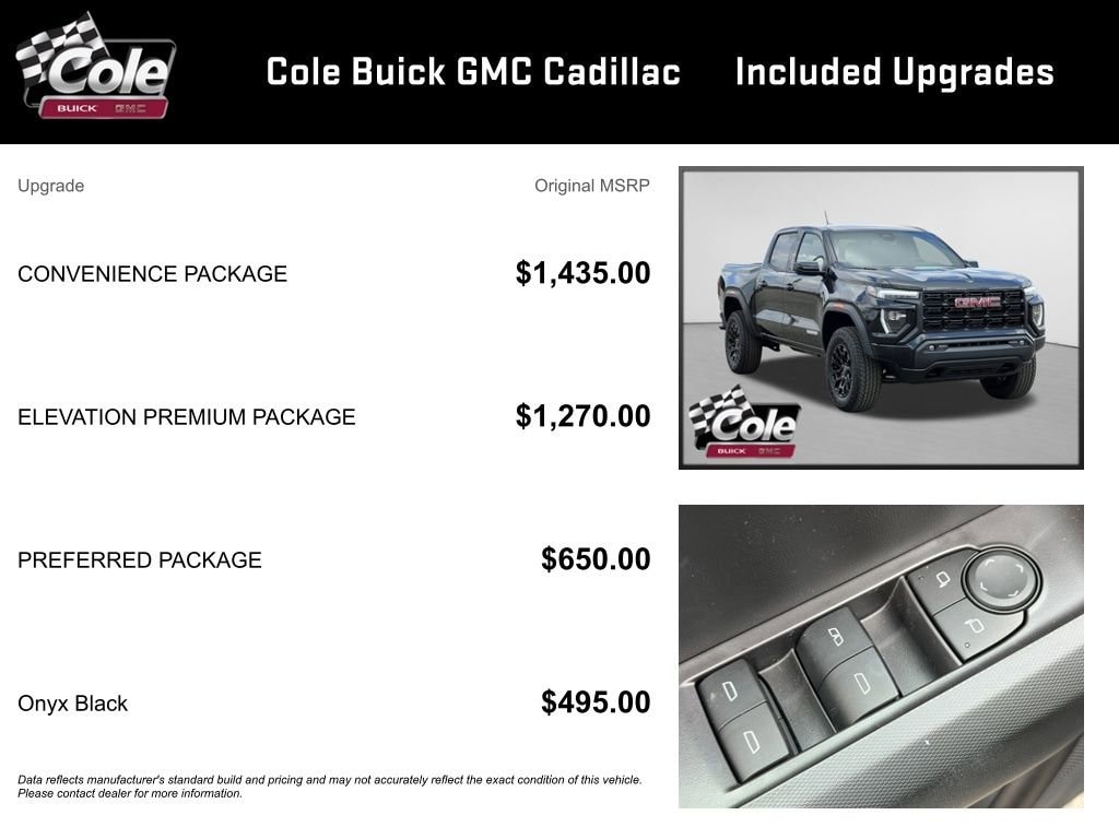 Price includes: $750 - Purchase Allowance. Exp. 04/30/2026 WE DELIVER! BUY ONLINE-TEXT-EMAIL-CHAT-PHONE AND WE WILL DELIVER YOUR NEXT VEHICLE TO YOUR DOOR! FROM OUR SALES FLOOR TO YOUR DOOR! IT'S THAT EASY! All New Car Pricing Assumes GMS Employee Qualifications. Onyx Black 2026 GMC Canyon Elevation 4WD 8-Speed Automatic 2.7L I4 Turbocharged DOHC 16V LEV3-SULEV30 310hp