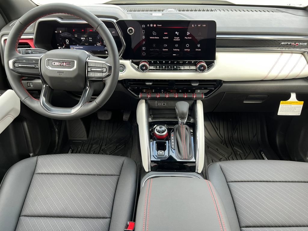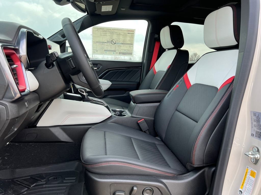 4WD, 120-Volt Bed Mounted Power Outlet, 1st and 2nd Rows All-Weather Floor Liners, 2 1st Row USB Charge/Data Ports, 2 Rear USB Ports in Center Console (Charge-Only), 3.42 Rear Axle Ratio, 4-Wheel Disc Brakes, 6-Way Power Passenger Seat Adjuster, 7 Speakers, 8-Way Power Driver Seat Adjuster, ABS brakes, Adaptive Cruise Control, Air Conditioning, Alloy wheels, AM/FM radio: SiriusXM with 360L, Apple CarPlay/Android Auto, AT4X, Auto High-beam Headlights, Auto-dimming Rear-View mirror, Automatic Emergency Braking, Automatic Stop/Start, Automatic temperature control, Black Finish Sport Upper Bodyside Moldings, Black Off-Road Rocker Protection, Blind Zone Steering Assist with Trailering, Brake assist, Bumpers: body-color, Canyon Pro Safety, Canyon Safety Plus Package, Compass, Delay-off headlights, Driver and Front Passenger Illuminated Visors, Driver and Front Passenger Ventilated Seats, Driver door bin, Driver Memory, Driver Mode Selector, Driver Seatback Map Pocket, Driver vanity mirror, Driver-Selectable Full-Locking Front Differential, Driver-Selectable Full-Locking Rear Differential, Dual front impact airbags, Dual front side impact airbags, Dual-Zone Automatic Climate Control Air Conditioning, Electronic Stability Control, Emergency communication system: OnStar, EZ-Lift and Lower Tailgate, Following Distance Indicator, Forward Collision Alert, Front anti-roll bar, Front Bucket Seats, Front Center Armrest, Front dual zone A/C, Front fog lights, Front LED Fog Lamps, Front Passenger Seatback Map Pocket, Front Pedestrian and Bicyclist Braking, Front reading lights, Front Side Laminated Solar Glazing Glass, Front wheel independent suspension, HD Surround Vision, Heads-Up Display, Heated door mirrors, Heated Driver and Front Passenger Seats, Heated front seats, Heated Steering Wheel, Heated steering wheel, Illuminated entry, Inside Rear-View Auto-Dimming Mirror, Integrated Trailer Brake Controller, IntelliBeam Automatic High Beam on/Off, Interior Overhead Courtesy Light with Dual Reading Lamp, Lane Keep Assist with Lane Departure Warning, Low tire pressure warning, Memory seat, Multicolor 6.3 Diagonal Head-Up Display, MultiStow Tailgate Storage Compartment, Navigation System, Occupant sensing airbag, Off-Road Suspension, Outside temperature display, Overhead airbag, Overhead console, Panic alarm, Passenger door bin, Passenger vanity mirror, Perforated Leather-Appointed Seat Trim, Power door mirrors, Power Driver Lumbar Control Seat Adjuster, Power driver seat, Power moonroof, Power Passenger Lumbar Control Seat Adjuster, Power passenger seat, Power steering, Power windows, Preferred Equipment Group 4TX, Premium 7-Speaker Bose Sound System, Radio data system, Radio: 11.3 Diagonal Premium GMC Infotainment System, Rear Center Fold-Down Armrest with 2 Cupholders, Rear Cross Traffic Braking, Rear of Console 120-Volt Power Outlet, Rear Pedestrian Alert, Rear reading lights, Rear seat center armrest, Rear step bumper, Rear window defroster, Red Seat Belt Color, Remote keyless entry, Remote Vehicle Starter System, Safety Alert Seat, Security system, SiriusXM with 360L, Speed control, Speed-sensing steering, Split folding rear seat, Spray-on Bedliner with GMC Logo, Steering wheel mounted audio controls, Stop/Start System Disable Button Engine Control, Tachometer, Tailgate Keyed Cylinder Lock, Telescoping steering wheel, Til and Telescopic Manual Steering Column, Tilt steering wheel, Traction control, Trailering App System, Trailering Package, Trip computer, Ultrasonic Rear Park Assist, Underbody Cameras, Variably intermit