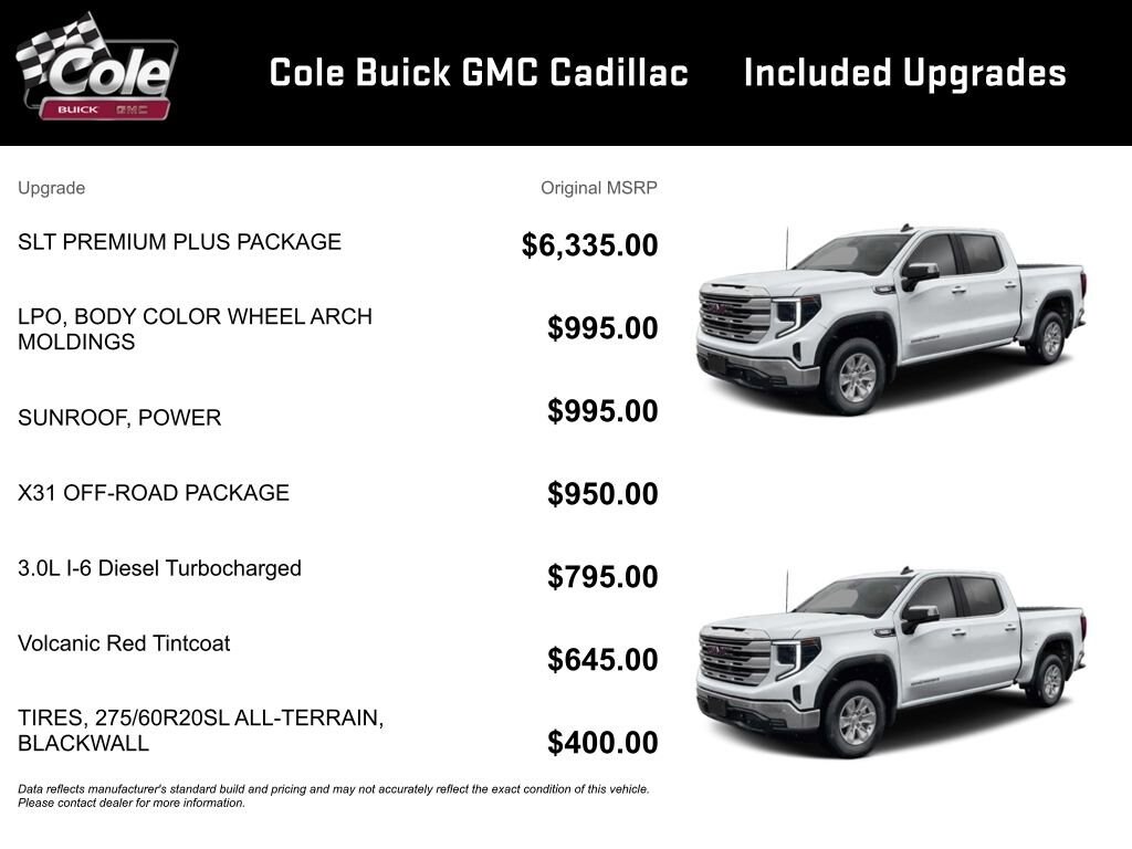 Price includes: $1750 - Buick & GMC GM Financial APR & NCC Consumer Cash Program: $1750 Allowance and 6.99% APR for 36 months. $30.87 per $1000 financed. Available to well qualified buyers who finance through GM Financial. XHD, NCC. Exp. 03/02/2026 WE DELIVER! BUY ONLINE-TEXT-EMAIL-CHAT-PHONE AND WE WILL DELIVER YOUR NEXT VEHICLE TO YOUR DOOR! FROM OUR SALES FLOOR TO YOUR DOOR! IT'S THAT EASY! Volcanic Red Tintcoat 2026 GMC Sierra 1500 SLT 4WD 10-Speed Automatic 3.0L I6