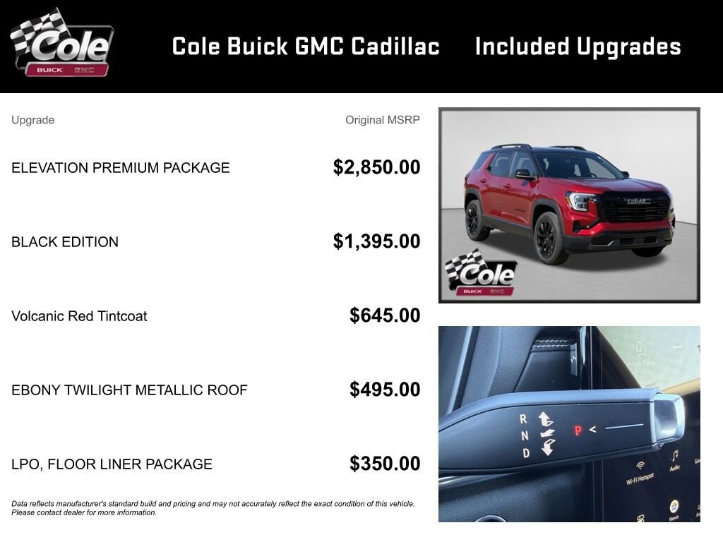 AWD, 2-Way Power Driver Lumbar Seat Adjuster, 3-Channel Programmable Universal Home Remote, 3.47 Final Drive Axle Ratio, 4-Wheel Disc Brakes, 6 Speakers, 6-Speaker Audio System Feature, 8-Way Power Driver Seat Adjuster, ABS brakes, Air Conditioning, All-Weather Cargo Mat, Alloy wheels, AM/FM radio: SiriusXM, Auto High-beam Headlights, Automatic temperature control, Autosense Hands-Free Programmable Power Liftgate, Black Edition, Black Exterior Accents and Black Exterior Badging, Black Mirror Caps, Brake assist, Brushed Aluminum Roof Rails, Bumpers: body-color, Cabin Humidity and Windshield Temperature Sensor, Compass, Convenience Package II, CoreTec Seat Trim, Darkened Grille and C Shaped Surrounding Bezel, Delay-off headlights, Driver 6-Way Manual Seat Adjuster, Driver and Front Passenger Heated Seats, Driver door bin, Driver vanity mirror, Dual front impact airbags, Dual front side impact airbags, Dual-Zone Automatic Climate Control, Ebony Twilight Metallic Roof, Ebony Twilight Mirror Caps, Electronic Stability Control, Elevation Premium Package, Emergency communication system: OnStar and GMC connected services capable, Floor Liner Package, Four wheel independent suspension, Front All-Weather Floor Liners, Front and Rear Black GMC Emblems, Front anti-roll bar, Front Bucket Seats, Front Center Armrest, Front Intermittent RainSense Wipers, Front Passenger 4-Way Manual Seat Adjuster, Front reading lights, Fully automatic headlights, Heated door mirrors, Heated front seats, Heated steering wheel, Heated Wiper Park, Illuminated entry, Low tire pressure warning, Navigation System, Occupant sensing airbag, Outside temperature display, Overhead airbag, Overhead Sunglass Storage, Panic alarm, Passenger door bin, Passenger vanity mirror, Power door mirrors, Power steering, Power windows, Preferred Equipment Group 3SB, Premium Cloth Seat Trim, Radio data system, Radio: Premium GMC Infotainment System, Rear air conditioning, Rear anti-roll bar, Rear seat center armrest, Rear window defroster, Rear window wiper, Remote keyless entry, Second Row All-Weather Mat, Security system, SiriusXM with 360L Trial Subscription, Speed control, Speed-sensing steering, Split folding rear seat, Spoiler, Sport steering wheel, Steering wheel mounted audio controls, Tachometer, Telescoping steering wheel, Tilt steering wheel, Traction control, Trip computer, Variably intermittent wipers, Wheels: 17 Grazen Metallic Machined Aluminum, Wheels: 19 Gloss Black Painted Aluminum, Wireless Apple CarPlay/Wireless Android Auto, Wireless Phone Charging For Portable Devices, AWD.