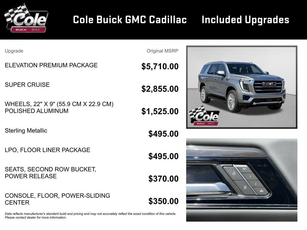 4WD, 10 Speakers, 15 Diagonal Multi-Color Head-Up Display, 1st and 2nd Rows All-Weather Floor Liners, 3.23 Rear Axle Ratio, 3rd Row All-Weather Floor Liners, 3rd row seats: split-bench, 4-Way Power Driver Lumbar Seat Adjuster, 4-Way Power Front Passenger Lumbar Seat Adjuster, 4-Wheel Disc Brakes, ABS brakes, Air Conditioning, All-Weather Cargo Mat, Alloy wheels, AM/FM radio: SiriusXM with 360L, Apple CarPlay/Android Auto, Audio memory, Auto High-beam Headlights, Auto-dimming door mirrors, Auto-dimming Rear-View mirror, Automatic temperature control, Blind Zone Steering Assist with Trailering, Bodyside moldings, Bose 10-Speaker Surround with CenterPoint, Brake assist, Bumpers: body-color, Compass, CoreTech/Perforated Leather-Appointed Seating, Delay-off headlights, Driver Attention Assist, Driver door bin, Driver vanity mirror, Dual front impact airbags, Dual front side impact airbags, Dual-Pane Panoramic Power Sunroof, Electronic Stability Control, Elevation Premium Package, Emergency communication system: OnStar and GMC connected services capable, Exterior Parking Camera Rear, Extra Capacity Cooling System, Floor Console, Floor Liner Package, Four wheel independent suspension, Front anti-roll bar, Front Bucket Seats, Front Center Armrest, Front dual zone A/C, Front fog lights, Front reading lights, Fully automatic headlights, Garage door transmitter, Heated door mirrors, Heated Driver and Front Passenger Seats, Heated front seats, Heated rear seats, Heated steering wheel, Hill Descent Control, Hitch View, Illuminated entry, Inside Rearview Auo-Dimming Rear Camera Mirror, Integrated Trailer Brake Controller, Low tire pressure warning, Max Trailering Package, Memory seat, Navigation system: GMC Connected Navigation, Occupant sensing airbag, Outside temperature display, Overhead airbag, Overhead console, Panic alarm, Passenger door bin, Passenger vanity mirror, Perforated Heated and Ventilated Driver and Front Passenger Seats, Power door mirrors, Power driver seat, Power Liftgate, Power passenger seat, Power Release 2nd Row Bucket Seats, Power steering, Power windows, Preferred Equipment Group 4SA, Premium Smooth Ride Suspension, Radio: 16.8 Diagonal Premium GMC Infotainment System, Rain sensing wipers, Rear air conditioning, Rear anti-roll bar, Rear reading lights, Rear seat center armrest, Rear Seat Media System, Rear window defroster, Rear window wiper, Remote keyless entry, Security system, SiriusXM with 360L, Smart Trailer Integration Indicator, Speed control, Speed-sensing steering, Split folding rear seat, Spoiler, Steering wheel mounted audio controls, Super Cruise, Tachometer, Technology Package, Telescoping steering wheel, Tilt steering wheel, Traction control, Trip computer, Turn signal indicator mirrors, Variably intermittent wipers, Voltmeter, Wheel Locks (set of 4), Wheels: 20 x 9 Machined and Painted, Wheels: 22 x 9 Polished Aluminum, 4WD.