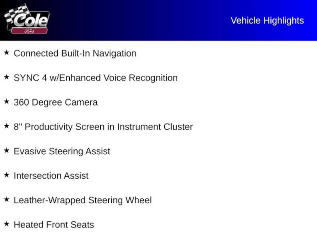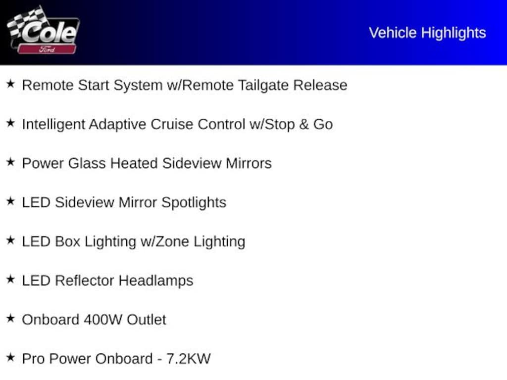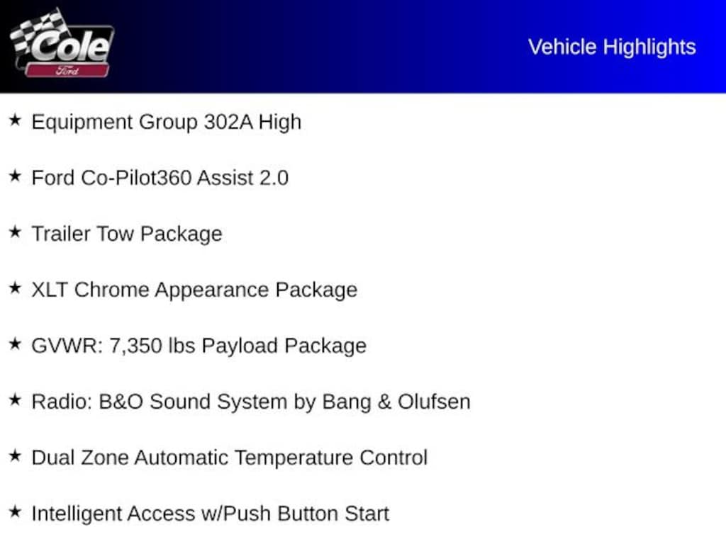 3.5L PowerBoost Full-Hybrid V6, 4WD, 10-Way Power Driver & Passenger Seats, 360 Degree Camera, 8" Productivity Screen in Instrument Cluster, Class IV Trailer Hitch Receiver, Connected Built-In Navigation, Dual Zone Automatic Temperature Control, Equipment Group 302A High, Evasive Steering Assist, Ford Co-Pilot360 Assist 2.0, GVWR: 7,350 lbs Payload Package, Heated Front Seats, Integrated Trailer Brake Controller, Intelligent Access w/Push Button Start, Intelligent Adaptive Cruise Control w/Stop & Go, Intersection Assist, Leather-Wrapped Steering Wheel, LED Box Lighting w/Zone Lighting, LED Reflector Headlamps, LED Sideview Mirror Spotlights, Onboard 400W Outlet, Power Glass Heated Sideview Mirrors, Pro Power Onboard - 7.2KW, Pro Trailer Backup Assist, Radio: B&O Sound System by Bang & Olufsen, Rear Under-Seat Storage, Remote Start System w/Remote Tailgate Release, SYNC 4 w/Enhanced Voice Recognition, Trailer Tow Package, XLT Chrome Appearance Package, 2-Bar Style Grille w/Chrome 2 Minor Bars, 4-Wheel Disc Brakes, 6 Speakers, ABS brakes, Air Conditioning, Alloy wheels, AM/FM radio, Auto High-beam Headlights, Auto-Dimming Rear-View Mirror, BoxLink, Brake assist, Bumpers: chrome, Chrome Door & Tailgate Handles w/Body-Color Bezel, Chrome Single-Tip Exhaust, Chrome Step Bars, Cloth 40/20/40 Front Seat, Compass, Delay-off headlights, Driver door bin, Driver vanity mirror, Dual front impact airbags, Dual front side impact airbags, Electronic Stability Control, Emergency communication system: SYNC 4 911 Assist, Exterior Parking Camera Rear, Front anti-roll bar, Front Center Armrest w/Storage, Front fog lights, Front reading lights, Front wheel independent suspension, Fully automatic headlights, Heated door mirrors, Illuminated entry, Low tire pressure warning, Manual-Folding Heated Pwr Glass Trailer Tow Mirror, Occupant sensing airbag, Outside temperature display, Overhead airbag, Overhead console, Panic alarm, Passenger door bin, Passenger vanity mirror, Power door mirrors, Power steering, Power windows, Power-Adjustable Pedals, Power-Sliding Rear Window, Radio data system, Radio: AM/FM SiriusXM w/360L, Radio: AM/FM Stereo w/6 Speakers, Rear reading lights, Rear step bumper, Rear window defroster, Remote keyless entry, SecuriCode Drivers Side Keyless-Entry Keypad, Security system, Speed control, Speed Sign Recognition, Speed-sensing steering, Split folding rear seat, Steering wheel mounted audio controls, SYNC 4, Tachometer, Tailgate Step w/Tailgate Work Surface, Telescoping steering wheel, Tilt steering wheel, Tough Bed Spray-In Bedliner, Traction control, Tray Style Floor Liner, Trip computer, Variably intermittent wipers, Voltmeter, Wheel Well Liner, Wheels: 17" Silver Painted Aluminum, Wheels: 18" Chrome-Like PVD, Wheels: 20" Chrome-Like PVD, 3.5L PowerBoost Full-Hybrid V6, 4WD, 10-Way Power Driver & Passenger Seats, 360 Degree Camera, 8" Productivity Screen in Instrument Cluster, Class IV Trailer Hitch Receiver, Connected Built-In Navigation, Dual Zone Automatic Temperature Control, Equipment Group 302A High, Evasive Steering Assist, Ford Co-Pilot360 Assist 2.0, GVWR: 7,350 lbs Payload Package, Heated Front Seats, Integrated Trailer Brake Controller, Intelligent Access w/Push Button Start, Intelligent Adaptive Cruise Control w/Stop & Go, Intersection Assist, Leather-Wrapped Steering Wheel, LED Box Lighting w/Zone Lighting, LED Reflector Headlamps, LED Sideview Mirror Spotlights, Onboard 400W Outlet, Power Glass Heated Sideview Mirrors, Pro Power Onboard - 7.2KW, Pro Trailer Backup Assist, Radio: B&O Sound System by Bang & Olufsen, Rear Under-Seat Storage, Remote Start System w/Remote Tailgate Release, SYNC 4 w/Enhan
