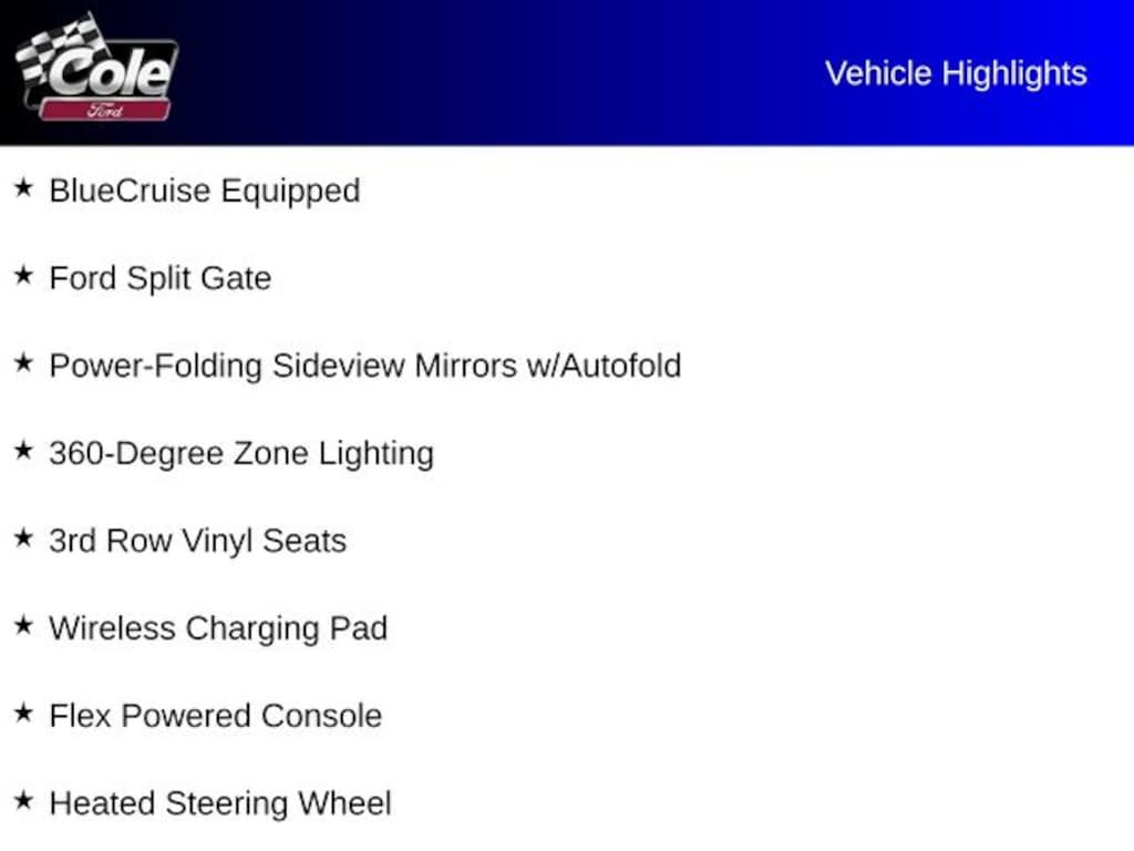 4WD, 110V/400W AC Power Outlet, 2nd Row Power-Folding Captain's Chairs, 360-Degree Zone Lighting, 3rd Row Flexible Seating, 3rd Row Vinyl Seats, 4-Door Intelligent Access (Lock/Unlock), ActiveX Front Heated Captain's Chairs, BlueCruise Equipped, Equipment Group 202A High Package, Flex Powered Console, Ford Split Gate, Front Side Laminated Glass, Heated Steering Wheel, Heavy-Duty Trailer Tow, Memory Driver Seat, Navigation System, Power Panoramic Vista Roof w/Power Sunshade, Power Tilt/Telescopic Steering Wheel w/Memory, Power-Folding Sideview Mirrors w/Autofold, Rain Sensing Wipers, SecuriCode Keyless Entry Pad, Universal Garage Door Opener, USB Ports, Wheels: 20" Carbonized Gray Bright Machined Aluminum, Wireless Charging Pad, 26mm Engine Radiator, 3.73 Axle Ratio, 3rd row seats: split-bench, 4-Wheel Disc Brakes, 6 Speakers, ABS brakes, Air Conditioning, Alloy wheels, AM/FM radio: SiriusXM with 360L, Apple CarPlay/Android Auto, Auto High-beam Headlights, Auto-dimming Rear-View mirror, Automatic temperature control, Brake assist, Bumpers: body-color, Cloth Front Captain's Chairs, Compass, Delay-off headlights, Driver door bin, Driver State Detection, Driver vanity mirror, Dual front impact airbags, Dual front side impact airbags, Electronic Stability Control, Emergency communication system: 911 Assist, Exterior Parking Camera Rear, Four wheel independent suspension, Front anti-roll bar, Front Bucket Seats, Front Center Armrest, Front dual zone A/C, Front License Plate Bracket, Front reading lights, Fully automatic headlights, Heated door mirrors, Illuminated entry, Integrated Trailer Brake Control, Intersection Assist, Low tire pressure warning, Occupant sensing airbag, Outside temperature display, Overhead airbag, Overhead console, Panic alarm, Passenger door bin, Passenger vanity mirror, Power door mirrors, Power driver seat, Power passenger seat, Power steering, Power windows, Radio data system, Radio: AM/FM Stereo w/MP3 Capable, Rear air conditioning, Rear anti-roll bar, Rear reading lights, Rear window defroster, Rear window wiper, Reclining 3rd row seat, Remote keyless entry, Security system, SiriusXM w/360L, Speed control, Speed-sensing steering, Speed-Sensitive Wipers, Split folding rear seat, Spoiler, Steering wheel mounted audio controls, Tachometer, Telescoping steering wheel, Tilt steering wheel, Traction control, Trip computer, Variably intermittent wipers, Voltmeter, Wheels: 18" Dark Alloy Painted Aluminum, 4WD, 110V/400W AC Power Outlet, 2nd Row Power-Folding Captain's Chairs, 360-Degree Zone Lighting, 3rd Row Flexible Seating, 3rd Row Vinyl Seats, 4-Door Intelligent Access (Lock/Unlock), ActiveX Front Heated Captain's Chairs, BlueCruise Equipped, Equipment Group 202A High Package, Flex Powered Console, Ford Split Gate, Front Side Laminated Glass, Heated Steering Wheel, Heavy-Duty Trailer Tow, Memory Driver Seat, Navigation System, Power Panoramic Vista Roof w/Power Sunshade, Power Tilt/Telescopic Steering Wheel w/Memory, Power-Folding Sideview Mirrors w/Autofold, Rain Sensing Wipers, SecuriCode Keyless Entry Pad, Universal Garage Door Opener, USB Ports, Wheels: 20" Carbonized Gray Bright Machined Aluminum, Wireless Charging Pad.