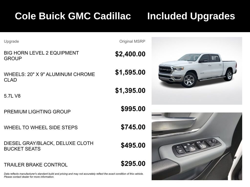 3 Rear Seat Head Restraints, 3.21 Rear Axle Ratio, 4 Way Front Headrests, 4-Wheel Disc Brakes, 48V Belt Starter Generator, 6 Speakers, ABS brakes, Air Conditioning, Alloy wheels, AM/FM radio, Big Horn Level 2 Equipment Group, Brake assist, Bumpers: chrome, Cloth Bench Seat, Compass, Delay-off headlights, Driver door bin, Dual front impact airbags, Dual front side impact airbags, Electronic Stability Control, Front & Rear Rubber Floor Mats, Front anti-roll bar, Front Center Armrest w/Storage, Front fog lights, Front LED Fog Lamps, Front reading lights, Front Seat Back Map Pockets, Front wheel independent suspension, Fully automatic headlights, GPS Antenna Input, Heated door mirrors, Illuminated entry, Leather steering wheel, LED Reflector Headlamps, LED Taillamps, Low tire pressure warning, Manufacturer's Statement of Origin, Occupant sensing airbag, Outside temperature display, Overhead airbag, Overhead console, Panic alarm, ParkSense Front/Rear Park Assist w/Stop, ParkView Rear Back-Up Camera, Passenger door bin, Passenger vanity mirror, Power door mirrors, Power steering, Power windows, Premium Lighting Group, Quick Order Package 25Z Big Horn/Lone Star, Radio data system, Radio: Uconnect 3 w/5 Display, Radio: Uconnect 4 w/8.4 Display, Rear 60/40 Folding Seat, Rear anti-roll bar, Rear seat center armrest, Rear step bumper, Rear Wheelhouse Liners, Remote keyless entry, Remote Start System, Single Disc Remote CD Player, Speed control, Split folding rear seat, Tachometer, Telescoping steering wheel, Tilt steering wheel, Traction control, Trailer Brake Control, Trip computer, Variably intermittent wipers, Voltmeter, Wheel to Wheel Side Steps, Wheels: 18 x 8, Wheels: 20 x 9 Aluminum Chrome Clad.